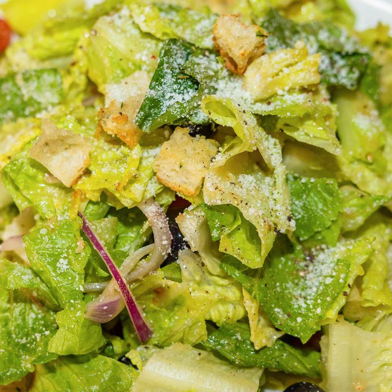 Romaine lettuce, cherry tomatoes, black olives, red onions & pepperoncini peppers, topped with croutons & parmesan cheese, served with Italian dressing.